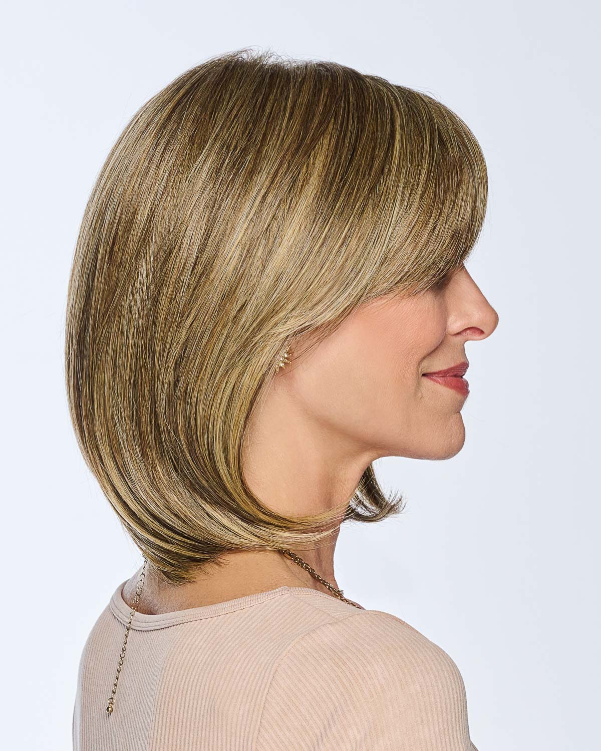 A customer request, this modern bob with a long bang that can be customized as you like. Brush the bang straight down and split in the center, sweep to the side or trim to be wispy or blunt. Style the bob turned under or flipped up. Change it up to suit your mood!