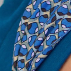 Mirabeau is a gorgeous turban style with a pretty geometric scarf in a contrasting pattern. Change the look by tying it up into a turban or leaving the scarf loose.