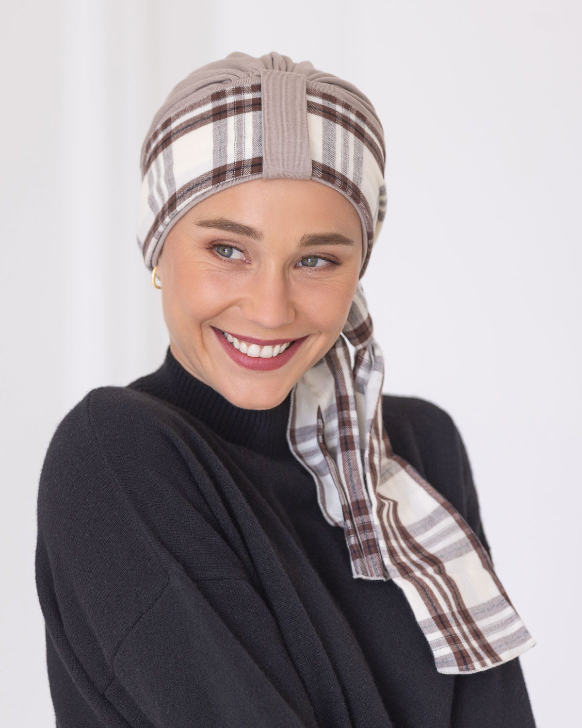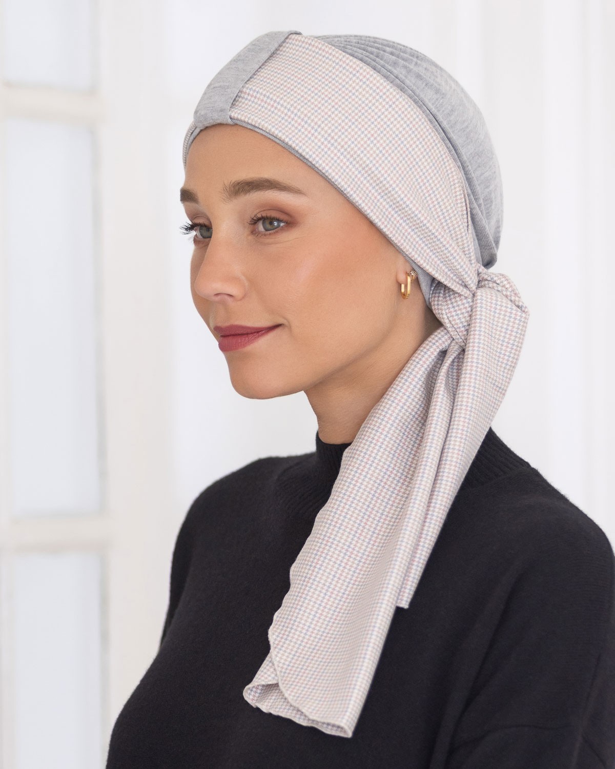 Mirabeau is a gorgeous turban style with a pretty geometric scarf in a contrasting pattern. Change the look by tying it up into a turban or leaving the scarf loose.