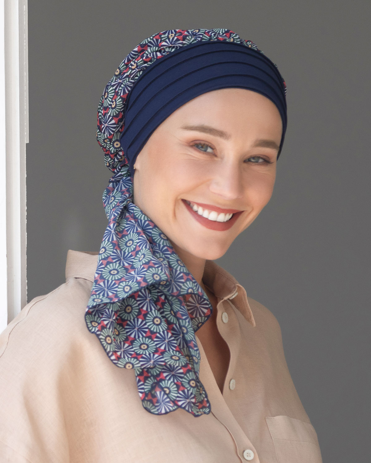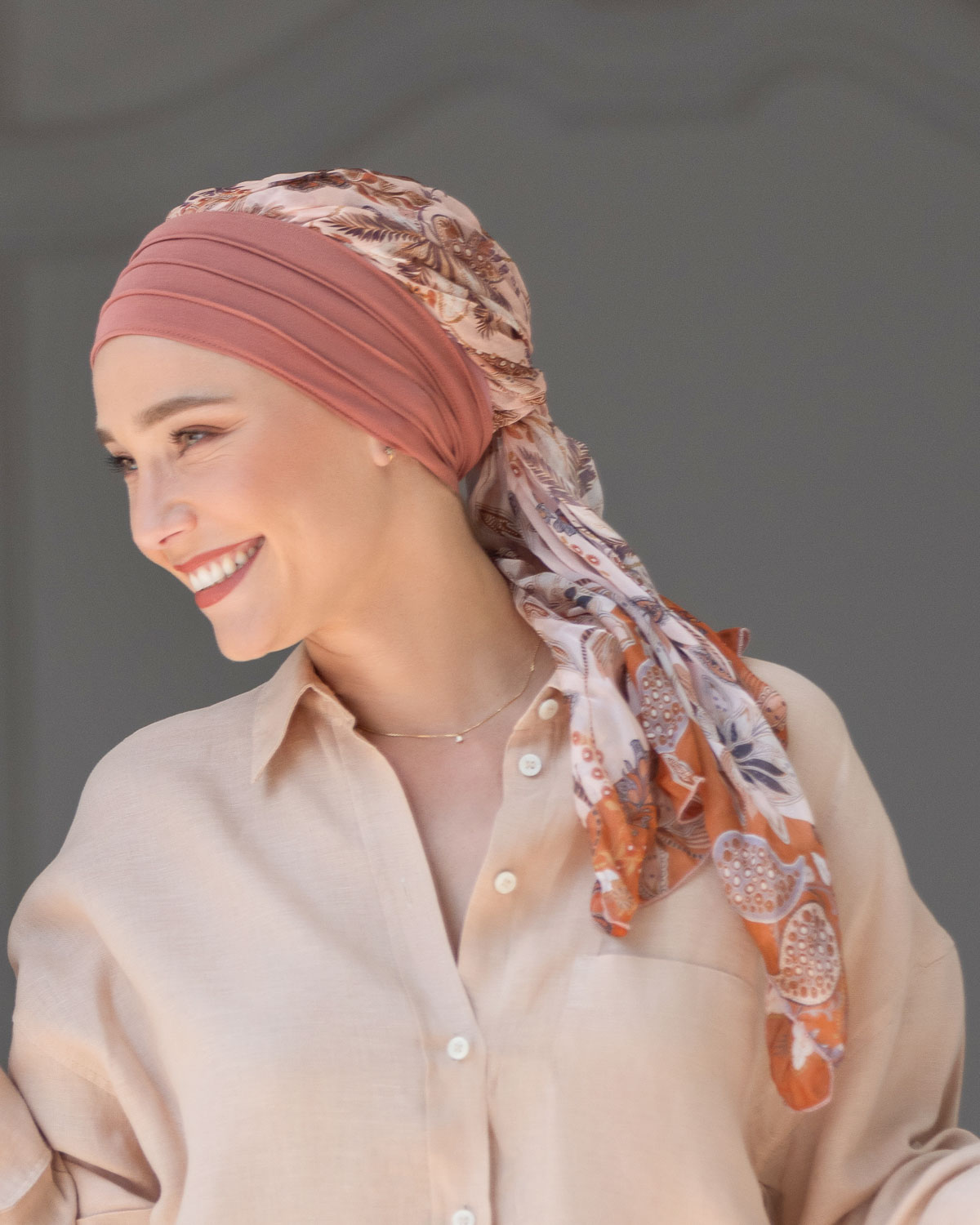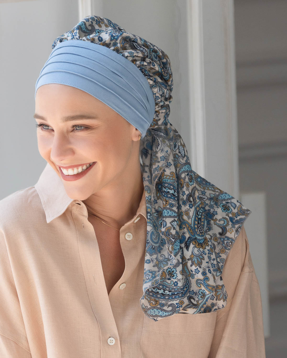 Notre Dame is a pretty lighweight turban style. With a light flowy scarf mounted on soft bamboo or cotton headband.