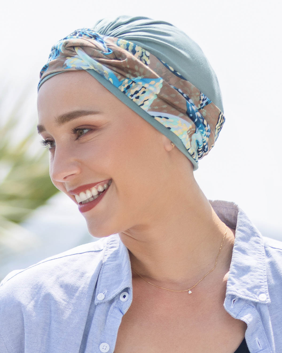 A beautiful light bamboo turban that's perfect for warmer days! The cross-over effect on the front gives it a chic, modern look