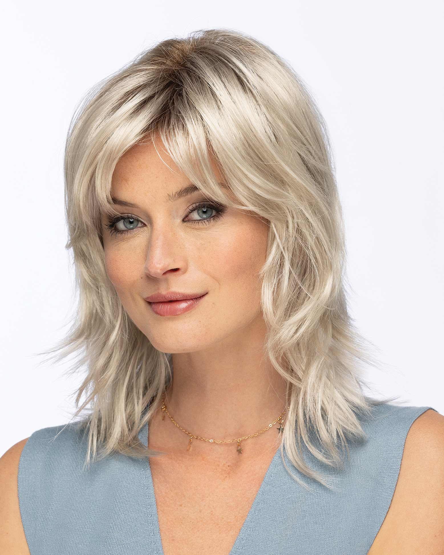 A modern take on the classic shag, this shoulder-length Paula Young® WhisperLite® Gia Wig is all about soft texture and easy movement. Airy layers add volume and dimension, while feathered ends keep your look light and wispy. The softly layered crown adds lift, and long, side-parted bangs create flattering face-framing pieces. The Stretch Lite Cap is made with an all-new lightweight mesh section that's durable yet breathable, reducing the cap's overall thickness and allowing for a more flexible fit.